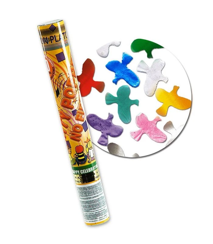 Tubo che spara coriandoli a forma di piccole colombe colorate. Meccanismo ad aria compressa, altezza cm.40. Esprimerai la tua voglia di pace liberando queste colombe colorate in un bellissimo arcobaleno.