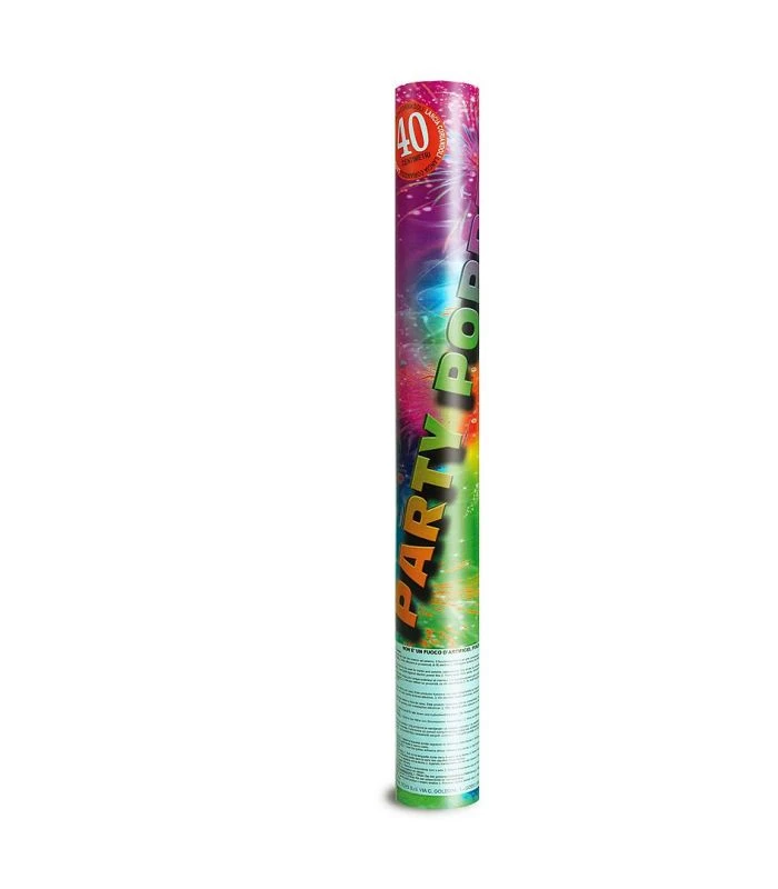 Tubo spara coriandoli e stelle filanti colorati con meccanismo ad aria compressa, alto cm. 40. Spara ad un’altezza di 20 metri stelle filanti e coriandoli colorati. Da utilizzare prettamente in luoghi aperti.