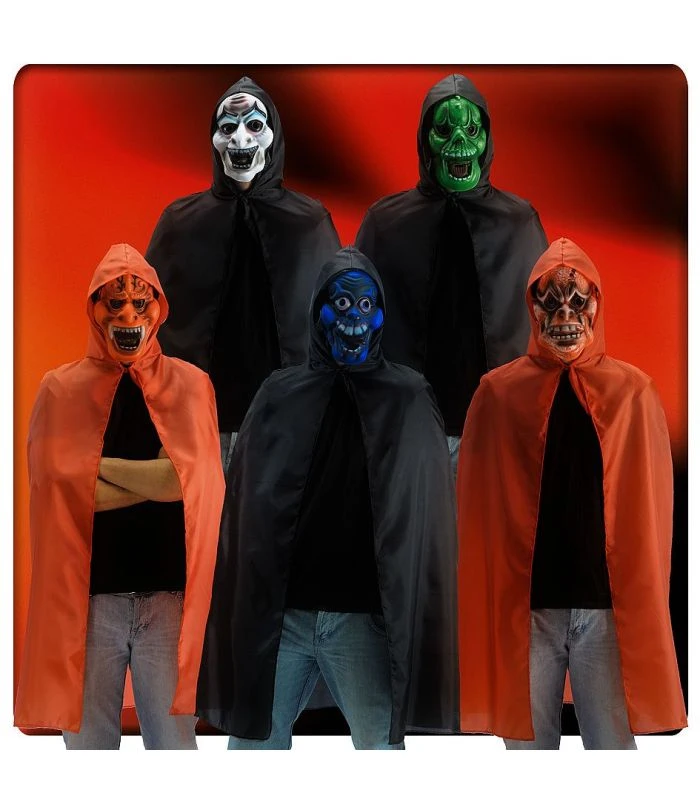 Set horror che comprende mantello, cappuccio e maschera in eva. Colori assortiti e diversi modelli. Per feste in maschera e Halloween. Stupisci tutti la sera di Halloween con un travestimento semplice ed economico.