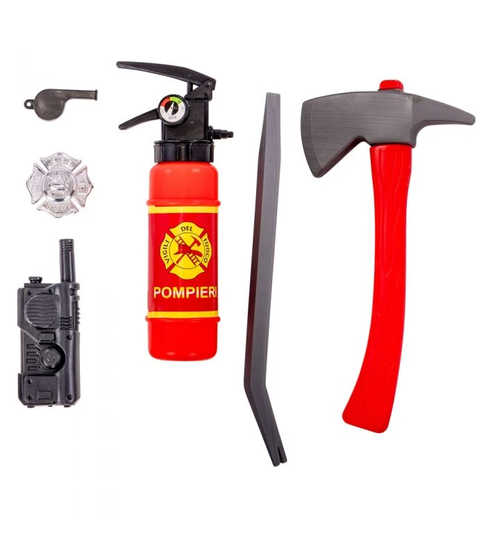 Set per costume da pompiere che comprende un estintore, accetta, distintivo, fischietto, radiolina e piede di porco.