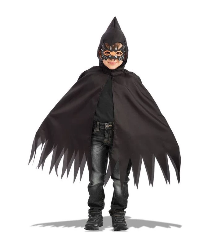 Set da ragnetto che comprende mantello con cappuccio e maschera in eva. Taglia unica da bambino. Ideale per feste in maschera e Halloween.