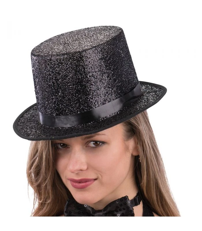 Cappello a tuba in tessuto lurex nero, alto cm.12 ca., in taglia 58, ideale per spettacoli di danza e cabaret.